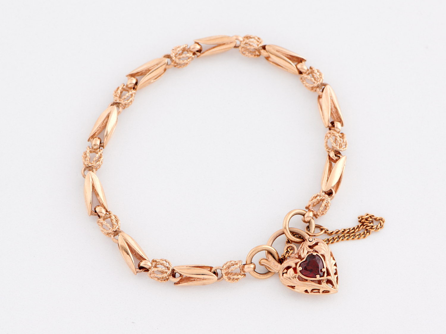 A GARNET SET FANCY LINK BRACELET IN 9CT GOLD, LENGTH 185MM, WEIGHT 13.5GMS