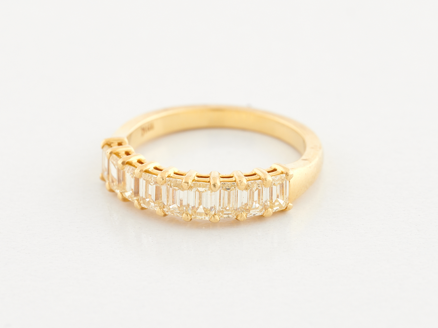 A YELLOW DIAMOND SET HALF HOOP RING IN 18CT GOLD, THE DIAMONDS TOTALLING 1.41CTS, RING SIZE M/N, 4.0GMS