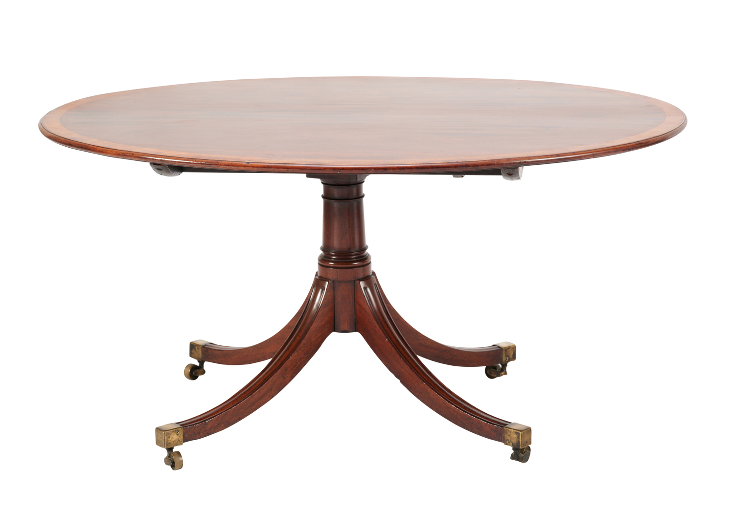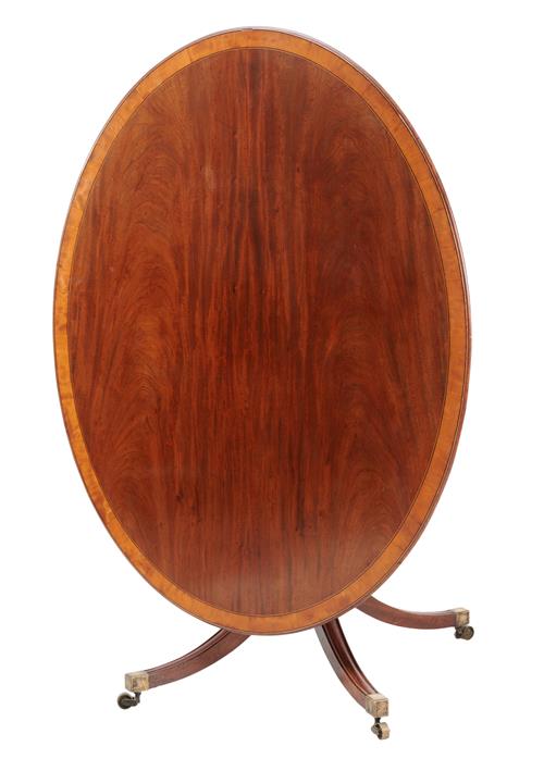 The tilting oval top cross-banded in satinwood raised on a turned pedestal and four outswept moulded supports with brass caps and casters