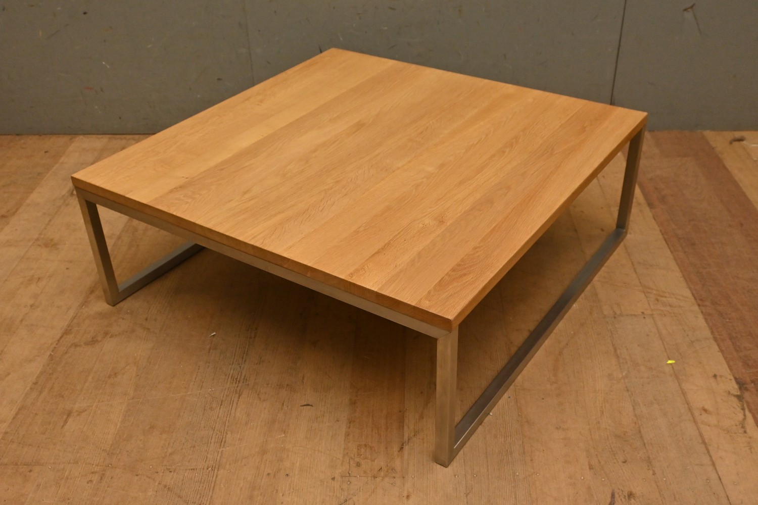 A CONTEMPEORARY OAK AND BRUSHED ALLUMINIUM COFFEE TABLE (A/F) ( 33H X 90W X 90D CM) (LEONARD JOEL DELIVERY SIZE: X-LARGE)