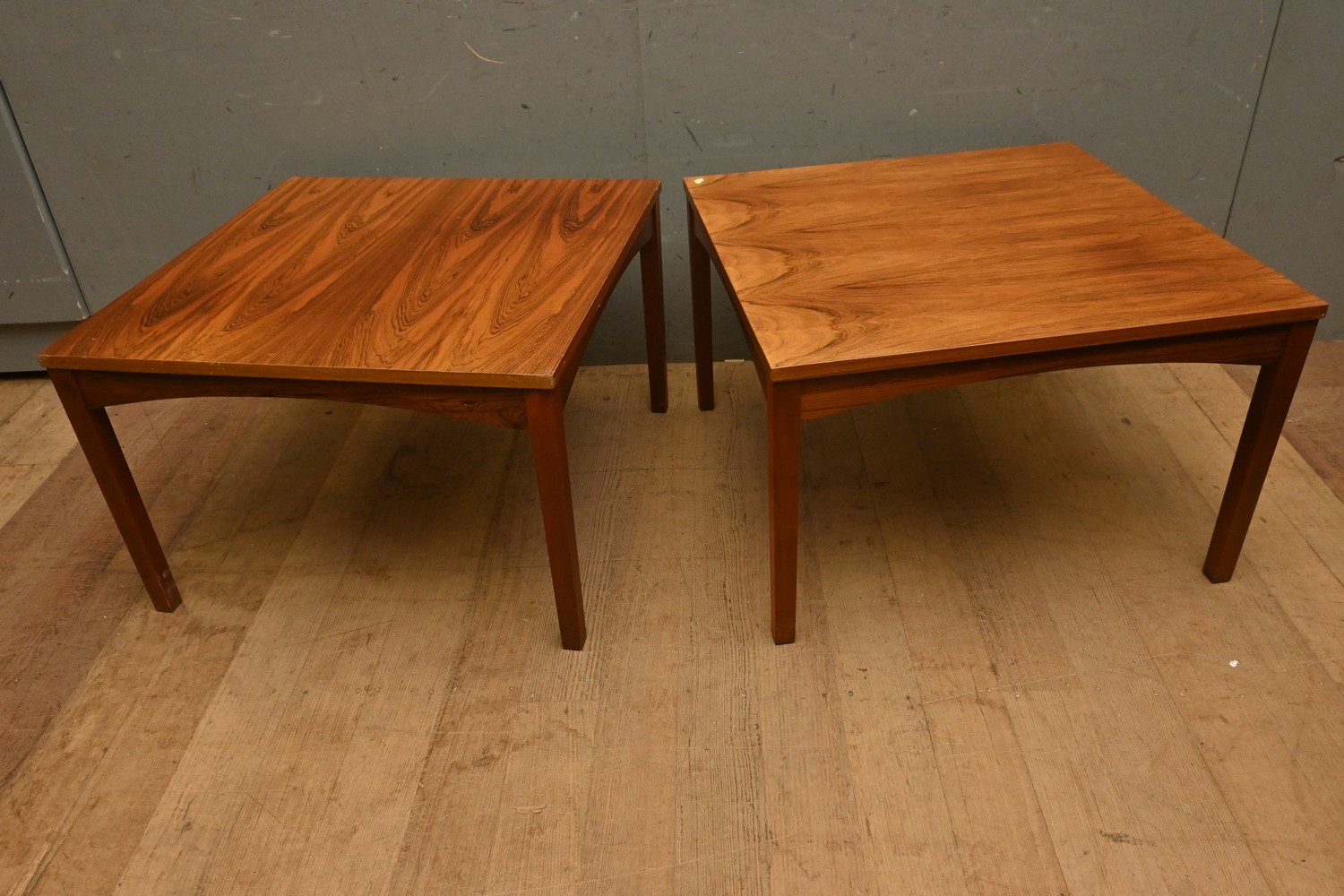 A PAIR OF DANISH MID-CENTURY COFFEE TABLES (A/F) (45H X 70W X 70D CM) (LEONARD JOEL DELIVERY SIZE: LARGE)