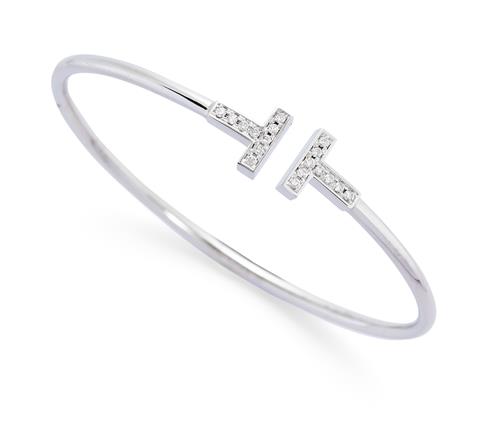The sprung wire bracelet terminating in a 'T' motif pavé-set with brilliant-cut diamonds, mounted in 18ct white gold, inner circumference 160mm, signed T&Co. Italy for Tiffany & Co.