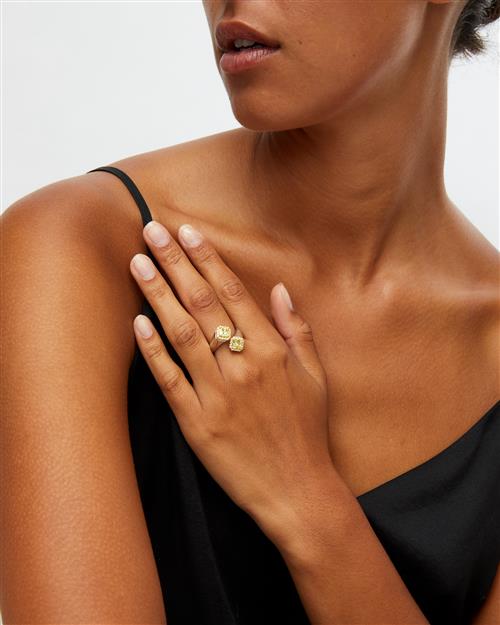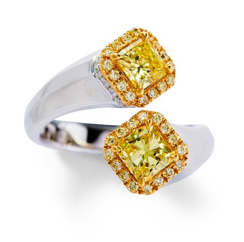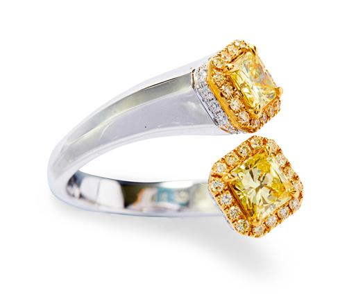 Of toi et moi design with cluster terminals, each claw-set with a fancy vivid yellow cut-cornered square modified brilliant-cut diamond framed by pavé-set natural fancy yellow brilliant-cut diamonds, the gallery further framed by similarly set near colourless diamonds, the fancy vivid yellow diamonds weighing 0.63 carats and 0.53 carats respectively, the small diamonds together weighing approximately 0.44 carats, mounted in 18ct gold, size M1/2.