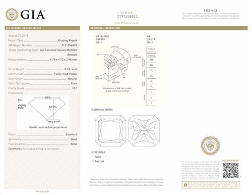 a GIA report numbered 2191556823, dated 3 August 2018, stating that the 0.53 carat diamond is natural, fancy vivid yellow colour, VS1 clarity.