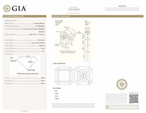 a GIA report numbered 5192556820, dated 3 August 2018, stating that the 0.63 carat diamond is natural, fancy vivid yellow colour, SI1 clarity;