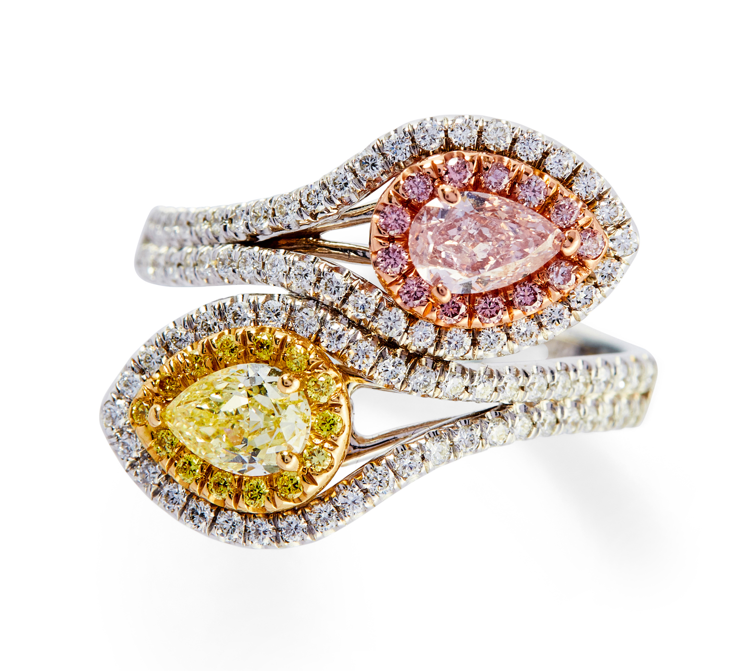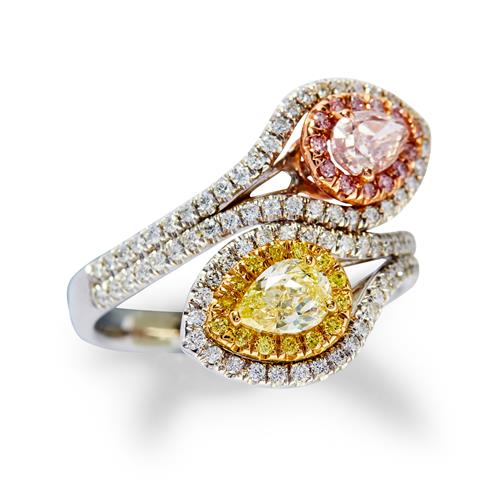 Of toi et moi design with cluster terminals, one claw-set with a natural fancy pink pear modified brilliant-cut diamond weighing 0.35 carats, framed by fancy pink brilliant-cut diamonds, the other similarly set with a fancy yellow pear-shaped diamond weighing approximately 0.34 carats, framed by fancy yellow brilliant-cut diamonds, the split shoulders pavé-set with near colourless diamonds, the small diamonds together weighing approximately 0.56 carats, mounted in 14ct gold, size L.