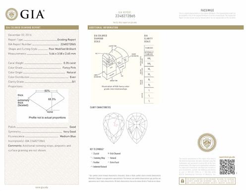 Accompanied by a GIA report numbered 2248272865, dated 2 December 2016, stating that the 0.35 carat diamond is natural, fancy pink colour, SI1 clarity, laser inscribed.