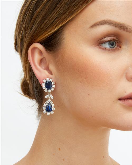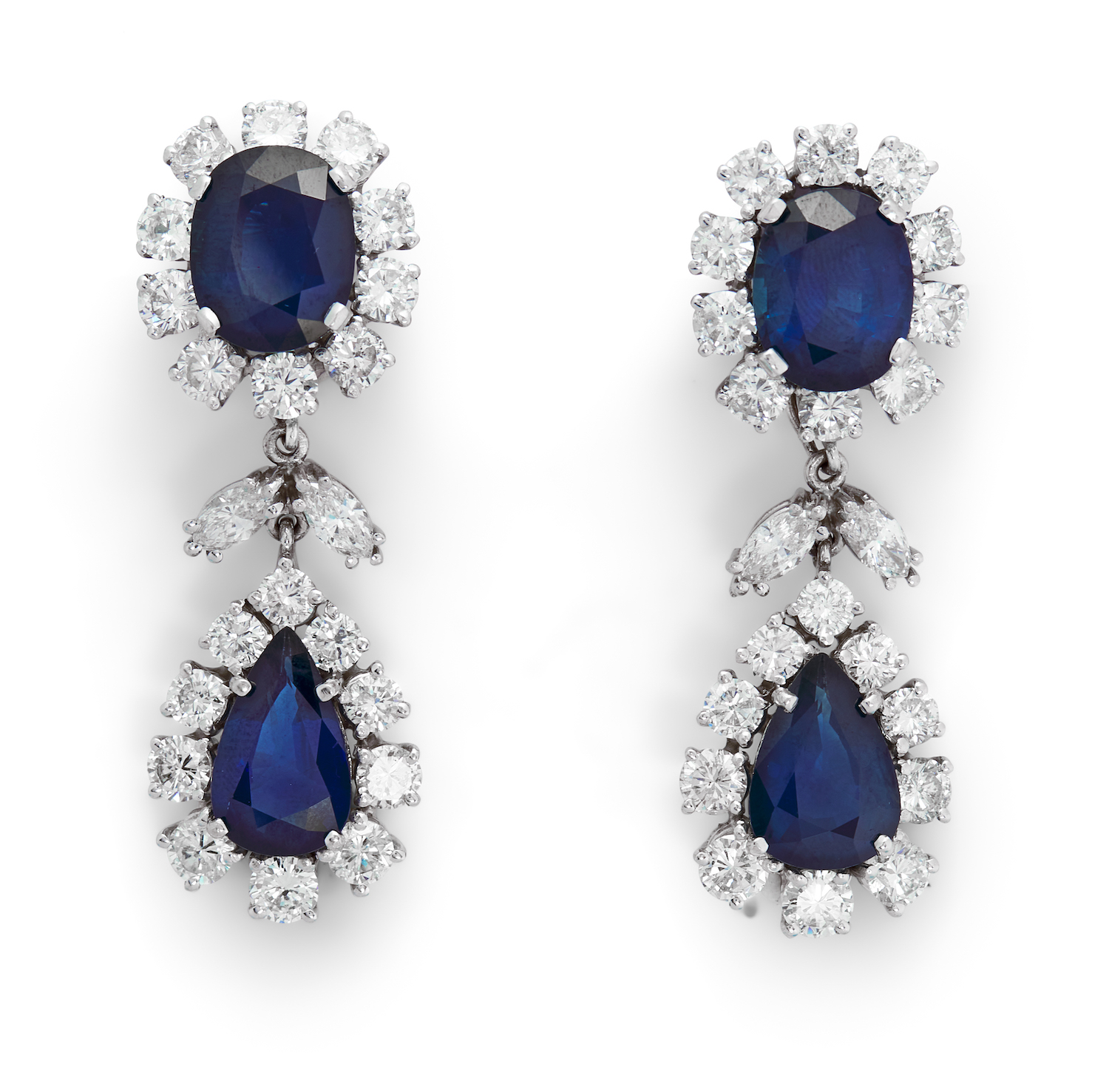 Each terminating on a detachable cluster swing drop, claw-set with a pear-shaped sapphire framed by a halo of brilliant-cut diamonds supported from a surmount decorated with an oval sapphire and brilliant-cut diamonds between a connector claw-set with a pair of marquise-cut diamonds, the sapphires and diamonds together weighing approximately 19.92 carats and 9.00 carats respectively, mounted in 14ct white gold, length 50mm, post and clip fittings.