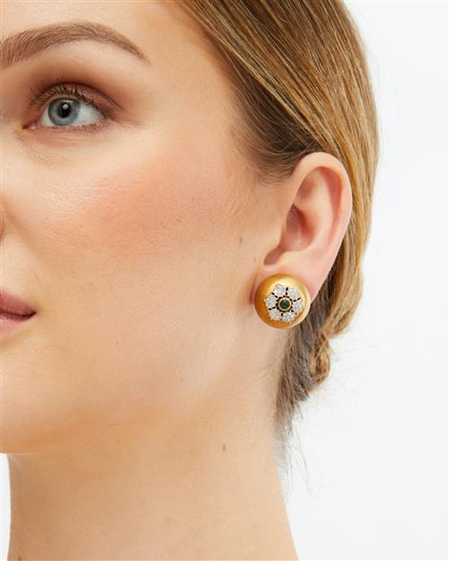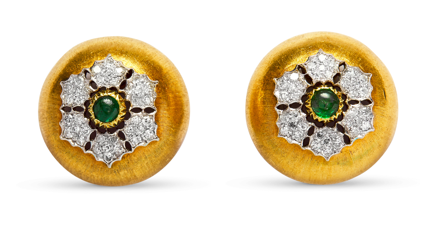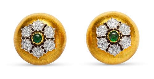 Each designed as a burin engraved dome centring a collet-set round cabochon emerald framed by an openwork garland of rosettes pavé-set with brilliant-cut diamonds, diameter 20mm, clip fittings, signed Buccellati Italy.