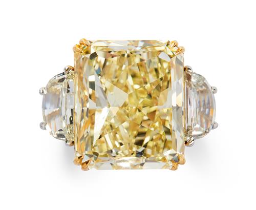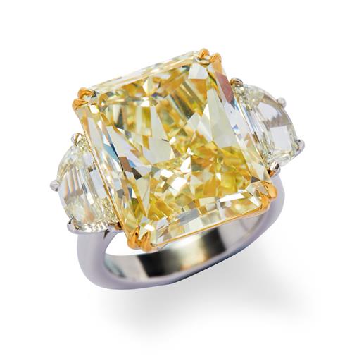 The fancy yellow cut-cornered rectangular modified brilliant-cut diamond weighing 26.15 carats, is claw-set between a pair of half moon-shaped diamonds, mounted in platinum and 18ct gold, size M1/2.