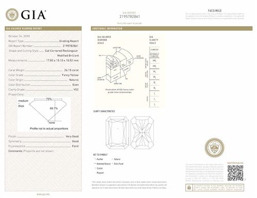 Accompanied by a GIA report numbered 2195782861, dated 24 October 2018, stating that the 26.15 carat diamond is natural, fancy yellow colour, VS2 clarity.