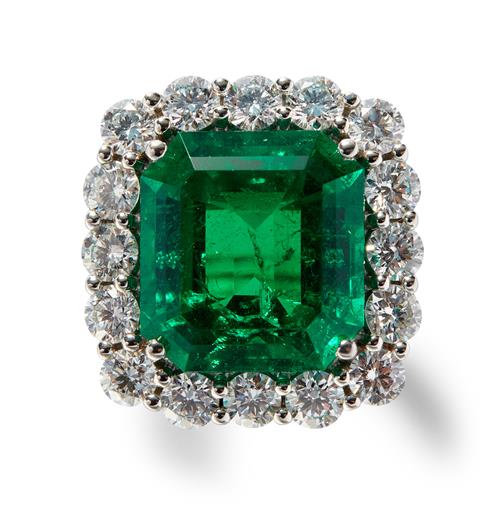 Of cluster design, centring a claw-set rectangular emerald-cut emerald weighing 11.02 carats, framed by a halo of brilliant-cut diamonds, the diamonds together weighing approximately 2.59 carats, mounted in platinum, size L1/2.