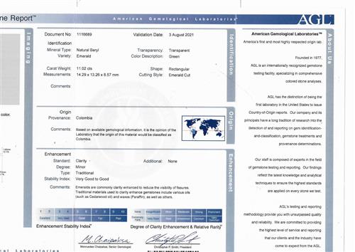 Accompanied by an AGL report numbered 1116689, dated 3 August 2021, stating that the 11.02 carat emerald is natural, with minor oil, of Colombian origin.