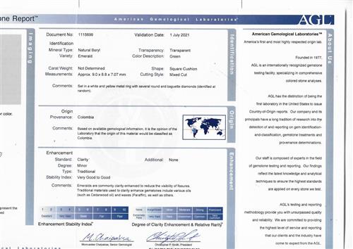 Accompanied by an AGL report numbered 1115699, dated 1 July 2021, stating that the emerald is natural, with minor oil, of Colombia origin.