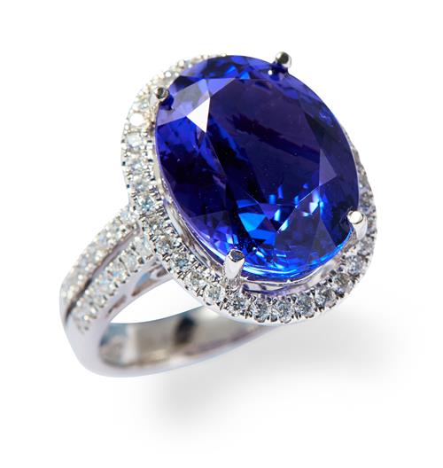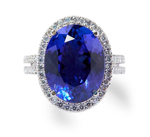 Of cluster design, centring a claw-set oval tanzanite weighing approximately 10.31 carats, framed by pavé-set brilliant-cut diamonds to similarly set split-shank shoulders, the small diamonds together weighing approximately 0.66 carat, mounted in 14ct white gold, size M1/2.