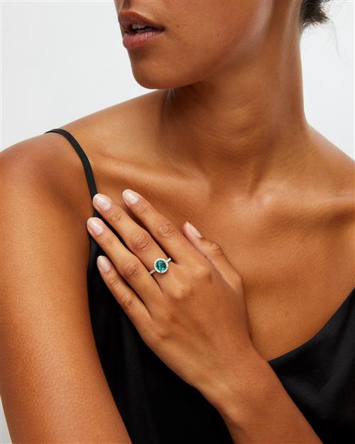 Of cluster design, centring a claw-set oval bluish green Paraiba tourmaline weighing 2.10 carats, framed by a line of pavé-set brilliant-cut diamonds to similarly set shoulders, the small diamonds together weighing approximately 0.63 carats, mounted in platinum, size K1/2.
