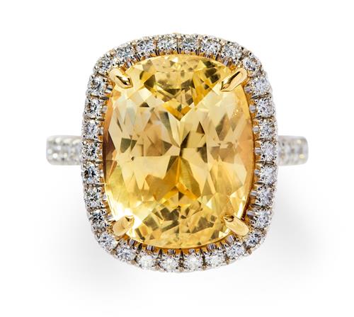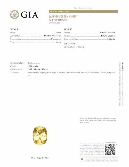 Accompanied by a GIA report numbered 2215242474, dated 4 November 2020, stating that the 10.94 carat yellow sapphire is natural, with no indications of heating, of Sri Lanka origin.