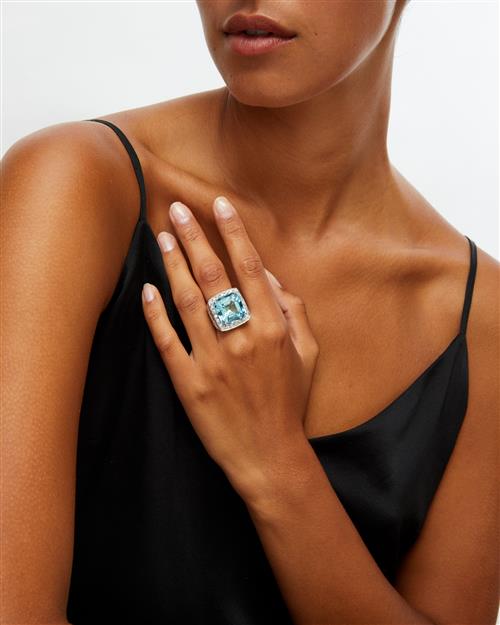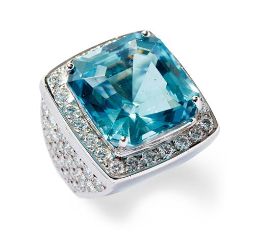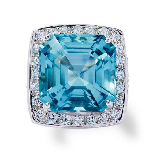 Of cluster design, centring a claw-set octagonal-shaped aquamarine weighing approximately 19.02 carats, framed by a halo of pavé-set brilliant-cut diamonds, to similarly set shoulders, the small diamonds together weighing approximately 2.00 carats, mounted in 18ct white gold, size N.