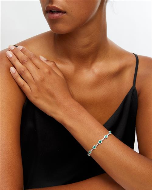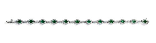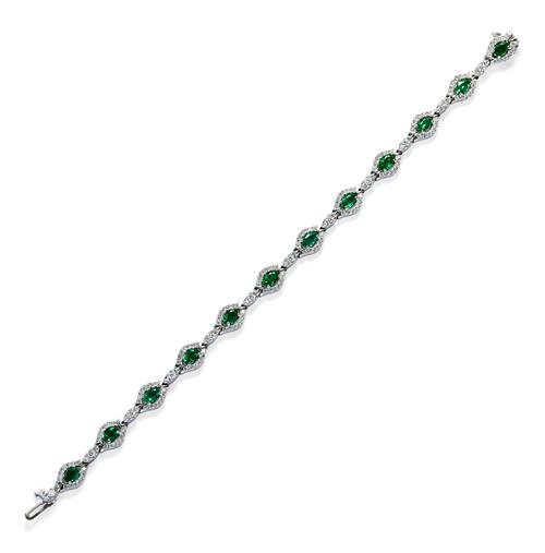 Composed of a line of 12 openwork clusters, each centring a claw-set oval emerald framed by a halo of brilliant-cut diamonds alternating between an elliptical connector claw-set with diamonds, the emeralds and diamonds together weighing approximately 2.40 carats and 1.97 carats respectively, mounted in 14ct white gold, length 180mm.