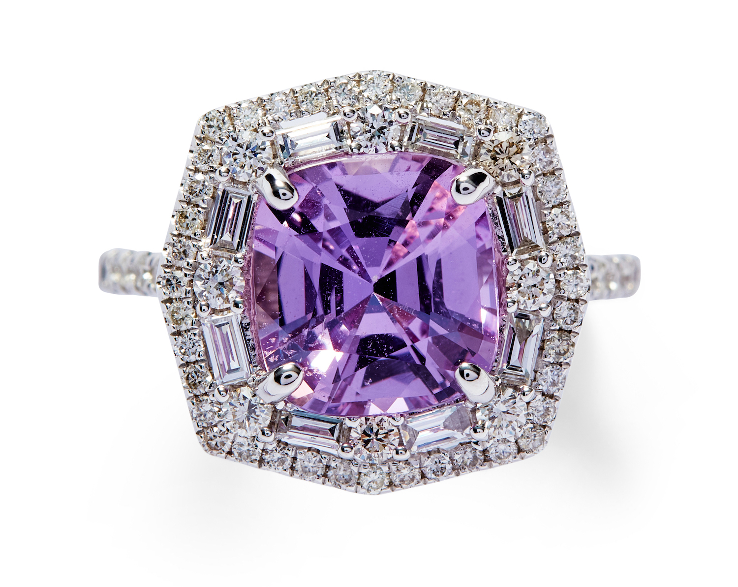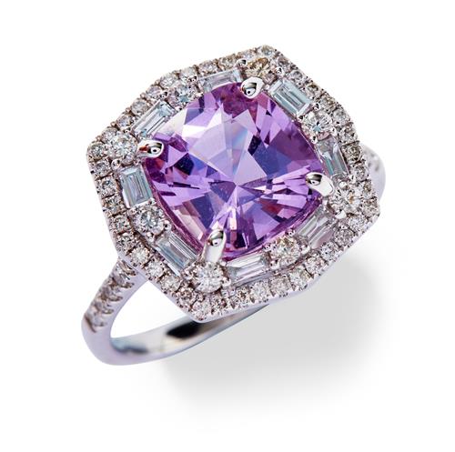 Of cluster design, centring a claw-set cushion-shaped pink-purple sapphire weighing 3.24 carats, framed by a line of baguette diamonds bordered by pavé-set brilliant-cut diamonds to similarly set shoulders, the diamonds together weighing approximately 0.68 carats, mounted in 14ct white gold, size M.