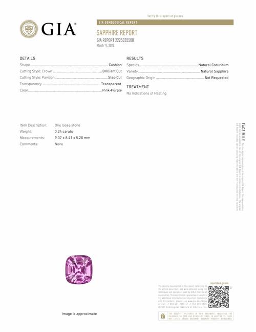 Accompanied by a GIA report numbered 2225335508, dated 14 March 2022 stating that the 3.24 carat pink-purple sapphire is natural, with no indications of heating.