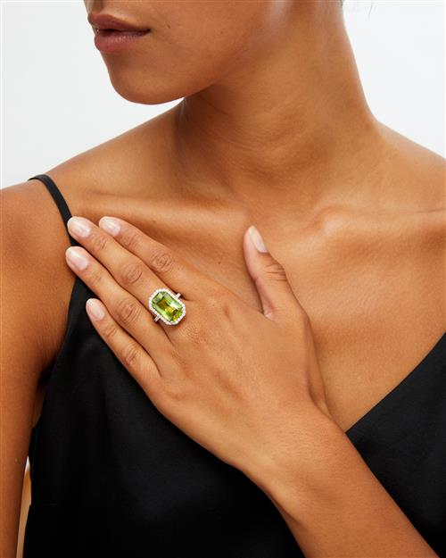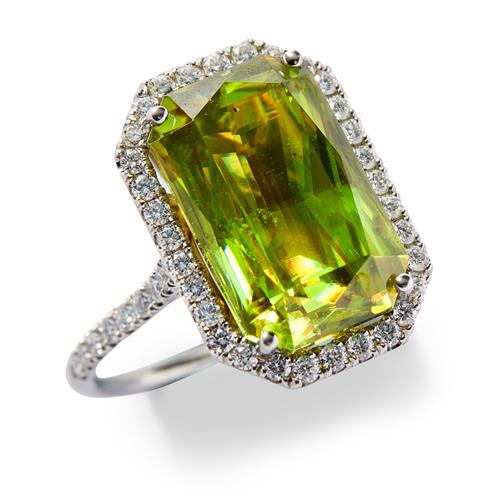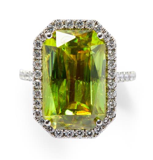 Of cluster design, centring a claw-set octagonal-shaped sphene weighing 14.38 carats, framed by a halo of brilliant-cut diamonds to similarly set shoulders, the 50 diamonds together weighing approximately 0.76 carats, mounted in platinum, size P.