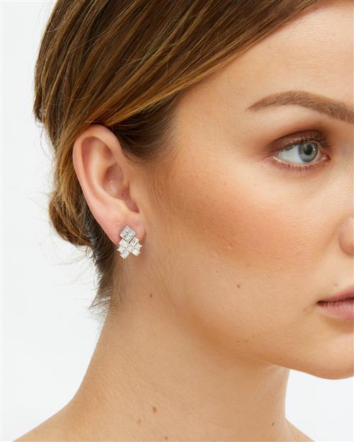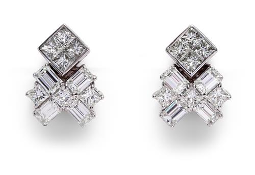 Each terminating in a geometric motif decorated with princess-cut and baguette diamonds surmounted by a cluster of princess-cut diamonds, the diamonds together weighing approximately 3.00 carats, mounted it 18ct white gold, length 11mm, post and scroll fittings.