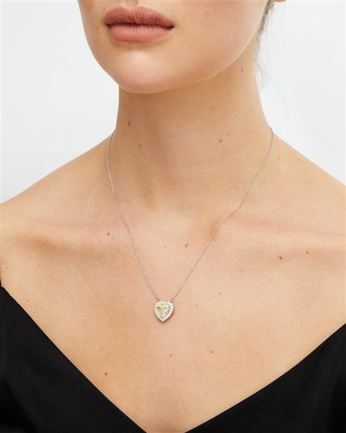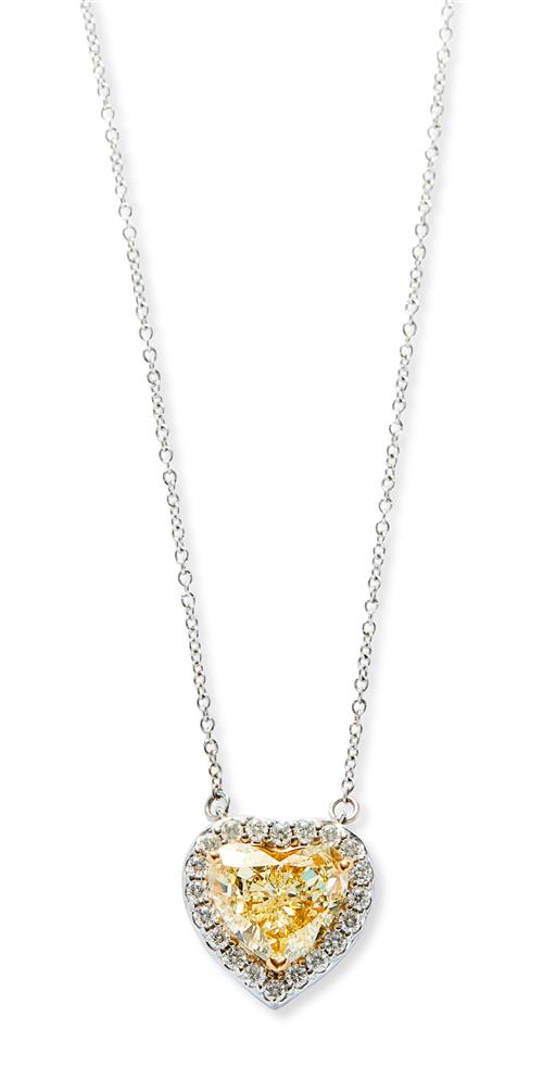 Centring a claw-set fancy light yellow heart-shaped diamond weighing approximately 2.67 carats, framed by a halo of near colourless brilliant-cut diamonds, completed by a trace link chain, the small diamonds together weighing approximately 0.40 carats, mounted in 18ct gold, pendant length 50mm, circumference 465mm, adjustable.