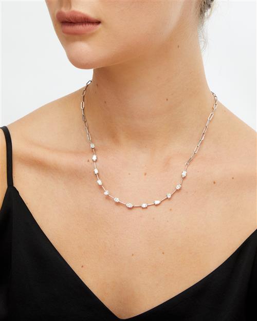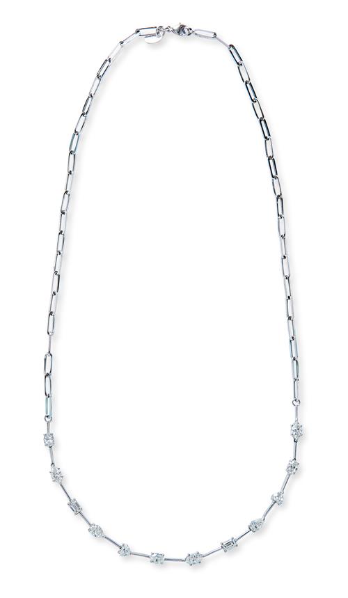 Designed as a collar, centring a line of claw-set marquise, emerald, oval and heart-shaped diamonds between rectangular bar connectors completed by a geometric link chain, the 11 diamonds together weighing approximately 5.10 carats, mounted in 14ct white gold, inner circumference 460mm.