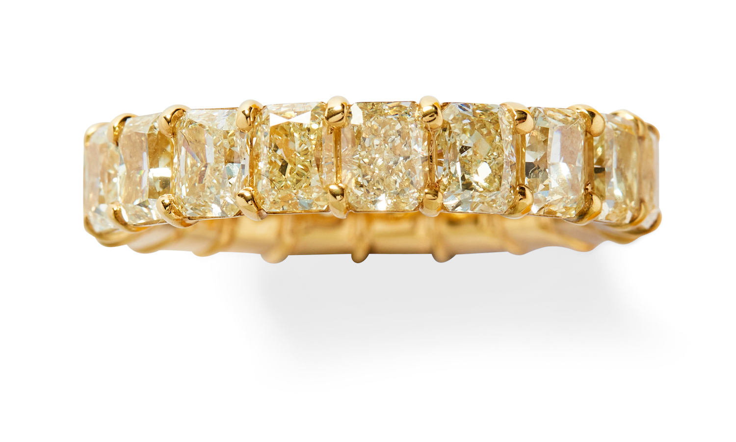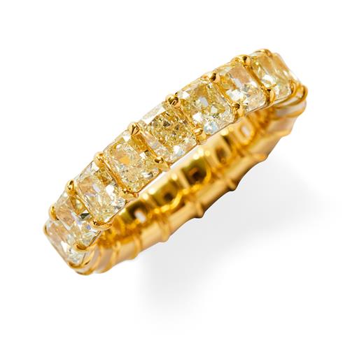 Designed as a continuous line of 19 claw-set fancy yellow radiant-cut diamonds together weighing 6.18 carats, mounted in 18ct gold, size M.
