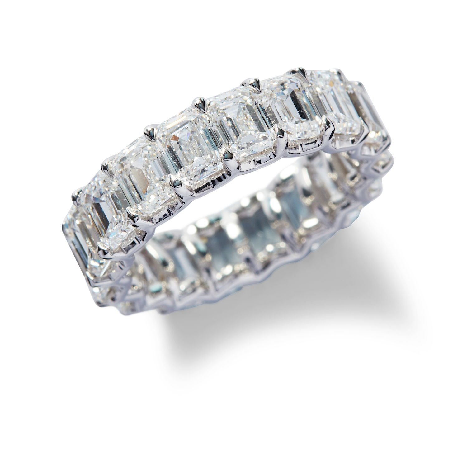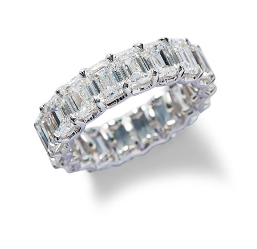 Designed as a continuous row of 18 claw-set emerald-cut diamonds together weighing 9.02 carats, mounted in 18ct white gold, size N.
