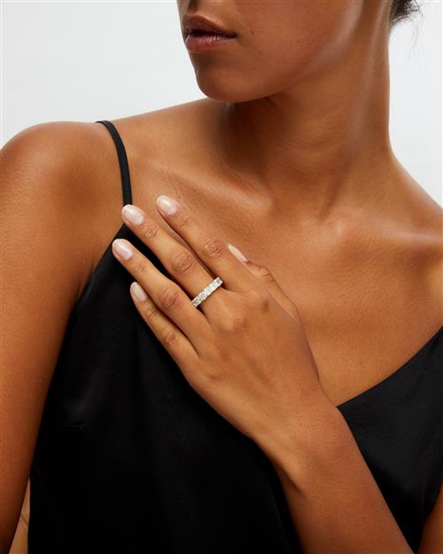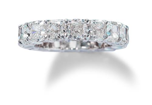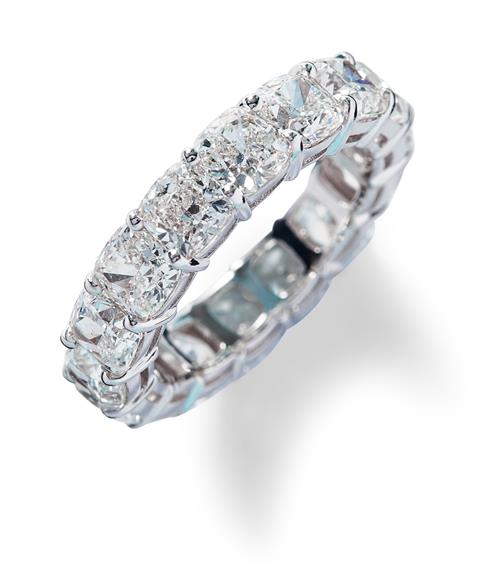 Designed as a continuous row of 16 claw-set cushion modified brilliant-cut diamonds together weighing 8.13 carats, mounted in 18ct white gold, size M.