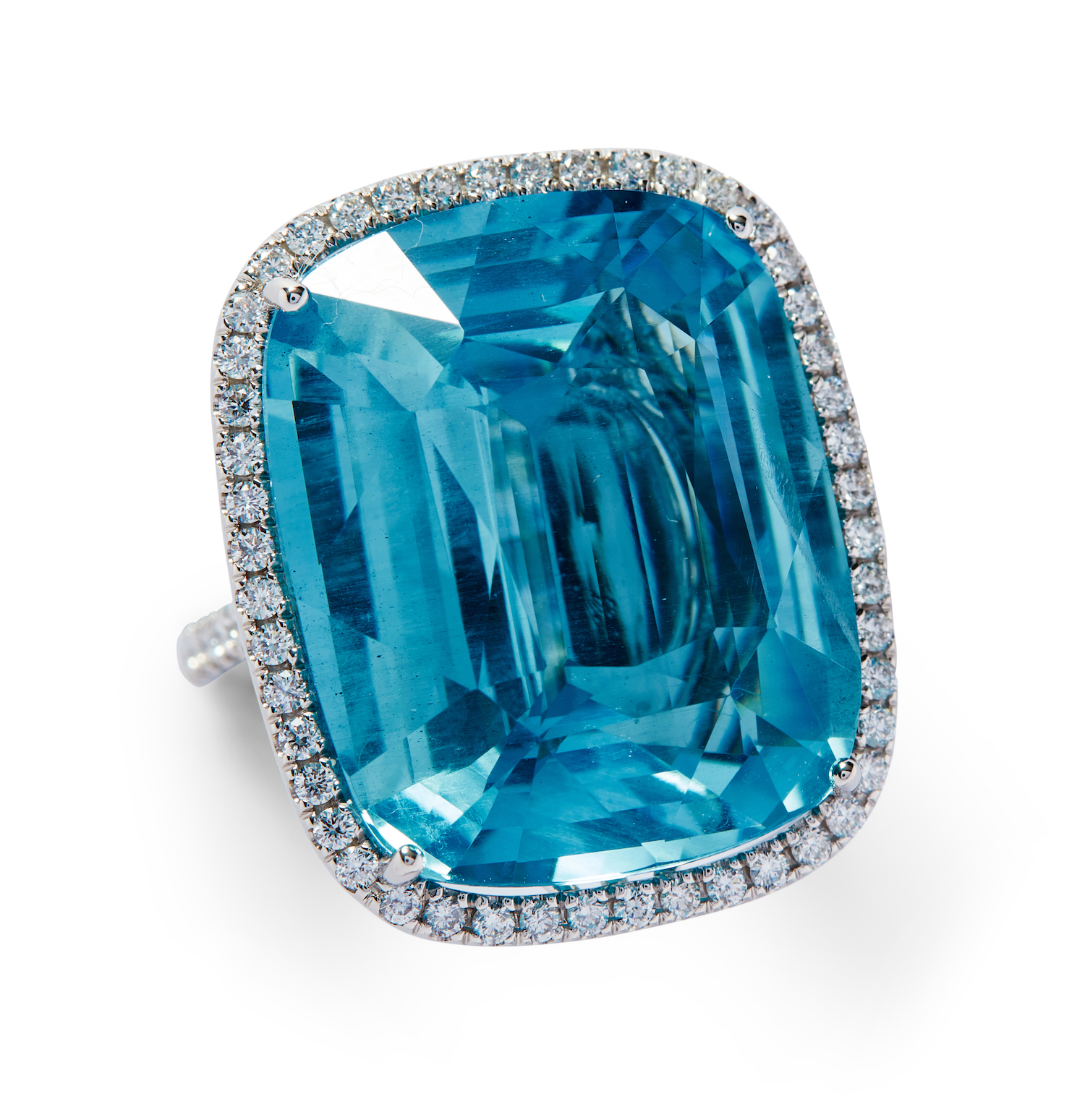 Of cluster design, centring a claw-set cushion-shaped aquamarine weighing approximately 30.20 carats, framed by a halo of brilliant-cut diamonds, to similarly set shoulders, the 68 small diamonds together weighing approximately 0.90 carats, mounted in platinum, size M1/2.