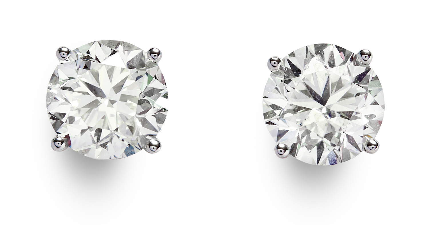 The brilliant-cut diamonds weighing 3.00 carats and 3.01 carats respectively, are claw-set, mounted in 18ct white gold, post and scroll fittings.
