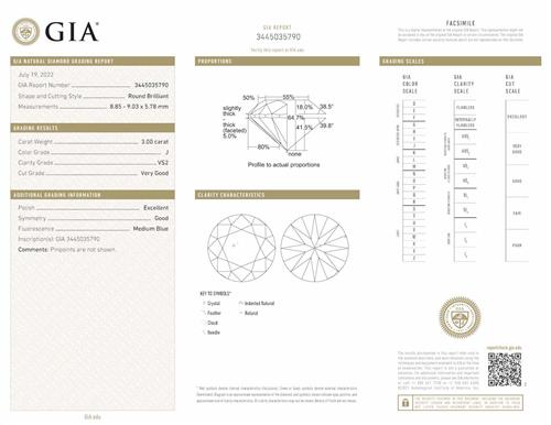 a GIA report numbered 3445035790, dated 19 July 2022, stating that the 3.00 carat diamond is natural, J colour, VS2 clarity, laser inscribed;