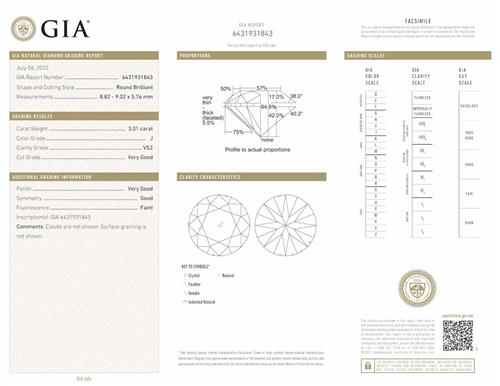 a GIA report numbered 6431931843, dated 6 July 2022, stating that the 3.01 carat diamond is natural, J colour, VS2 clarity, laser inscribed.
