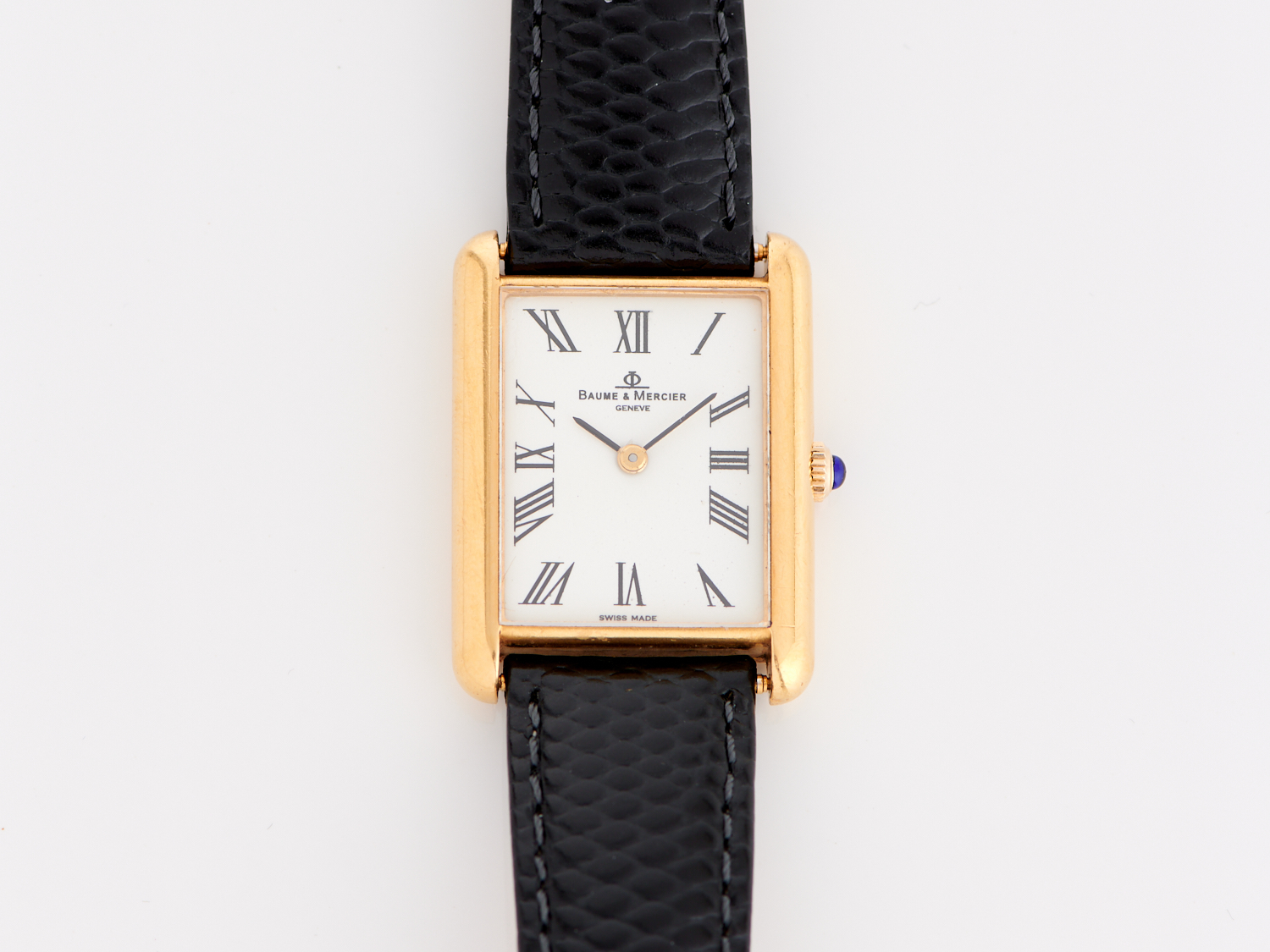 A BAUME & MERCIER LADIES WRISTWATCH IN 18CT GOLD, FACE 31 X 23MM, TO A LEATHER BAND, TOTAL LENGTH 195MM