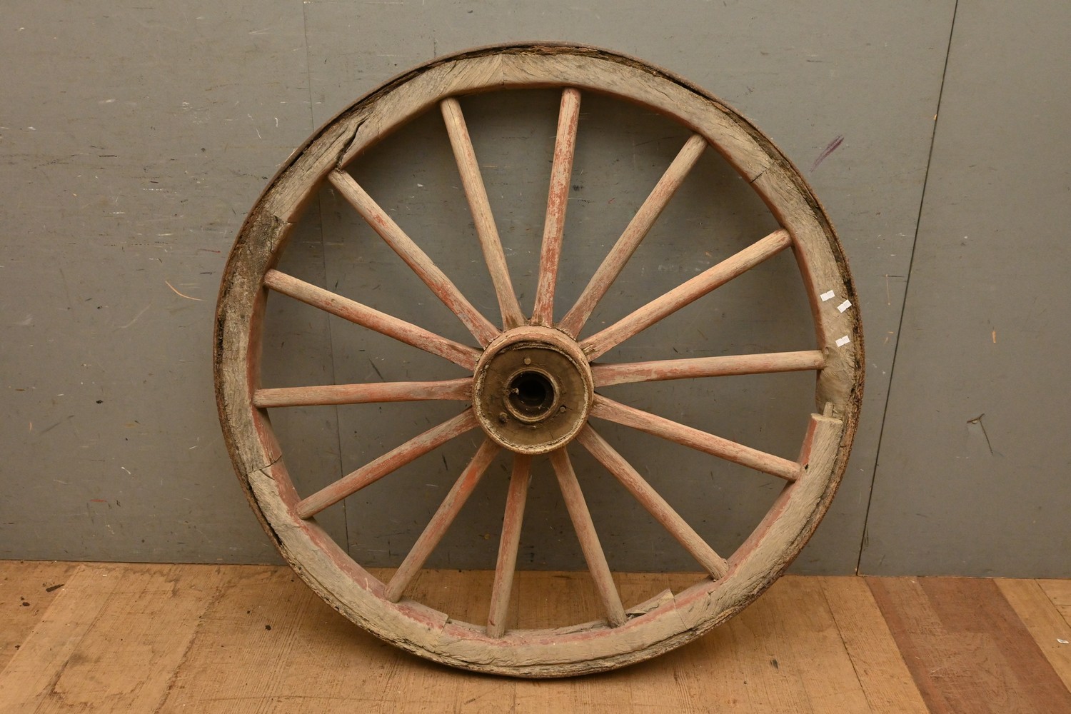 AN ANTIQUE WAGON WHEEL (A/F) (120 DIAMETER CM) (PLEASE NOTE THIS HEAVY ITEM MUST BE REMOVED BY CARRIERS AT THE CUSTOMER'S EXPENSE. LEONARD JOEL STAFF CANNOT ASSIST CARRYING THIS ITEM) (X-LARGE ITEM)