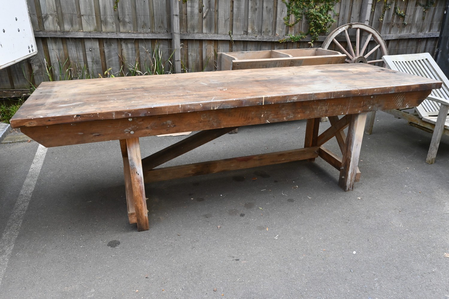 A RUSTIC WORK BENCH (A/F) (88H X 276W X 88D CM) (PLEASE NOTE THIS HEAVY ITEM MUST BE REMOVED BY CARRIERS AT THE CUSTOMER'S EXPENSE. LEONARD JOEL STAFF CANNOT ASSIST CARRYING THIS ITEM) (X-LARGE ITEM)