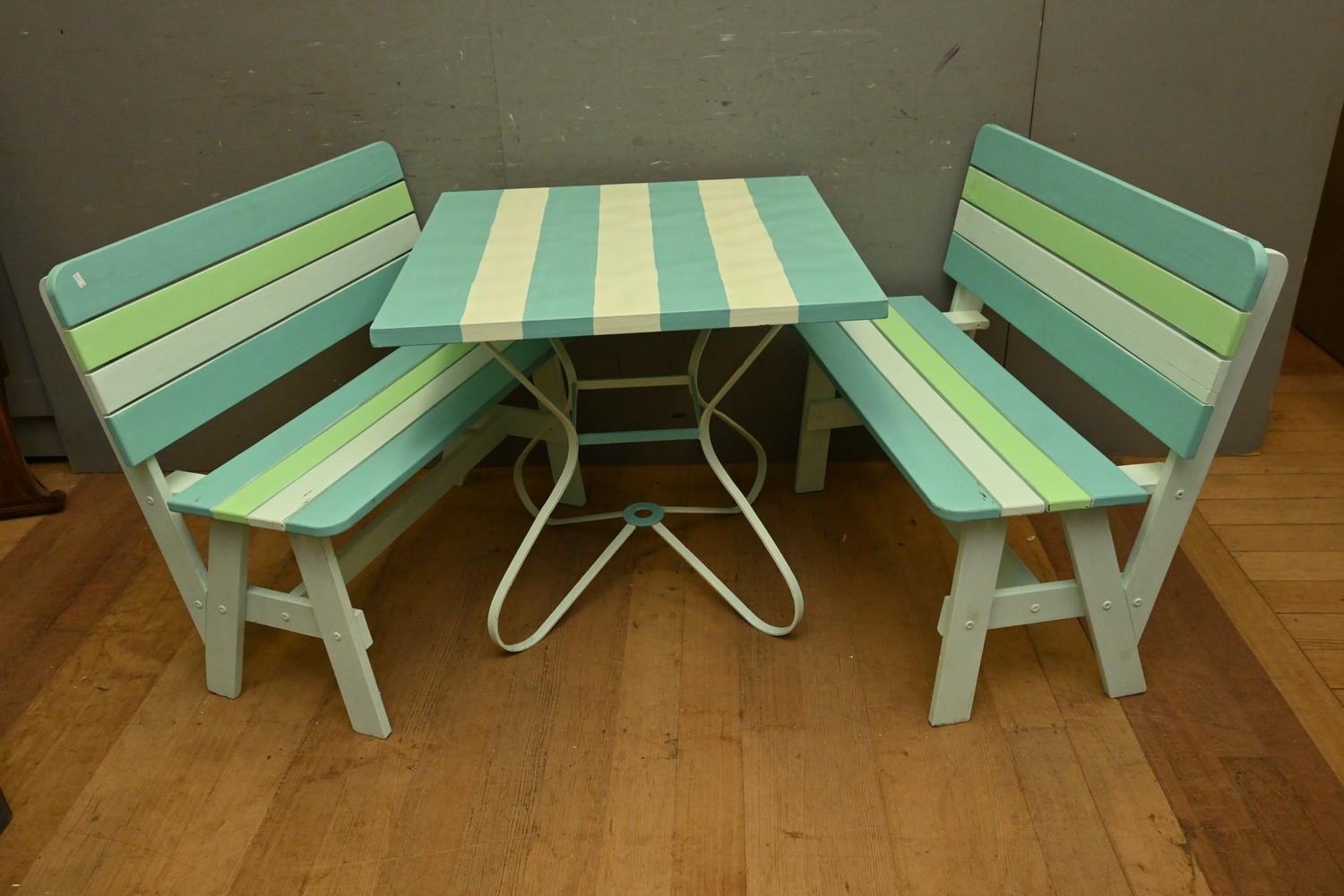 A THREE PIECE PAINTED OUTDOOR SETTING (A/F) ( 71H X 76W X 77D CM) (LEONARD JOEL DELIVERY SIZE: X-LARGE)