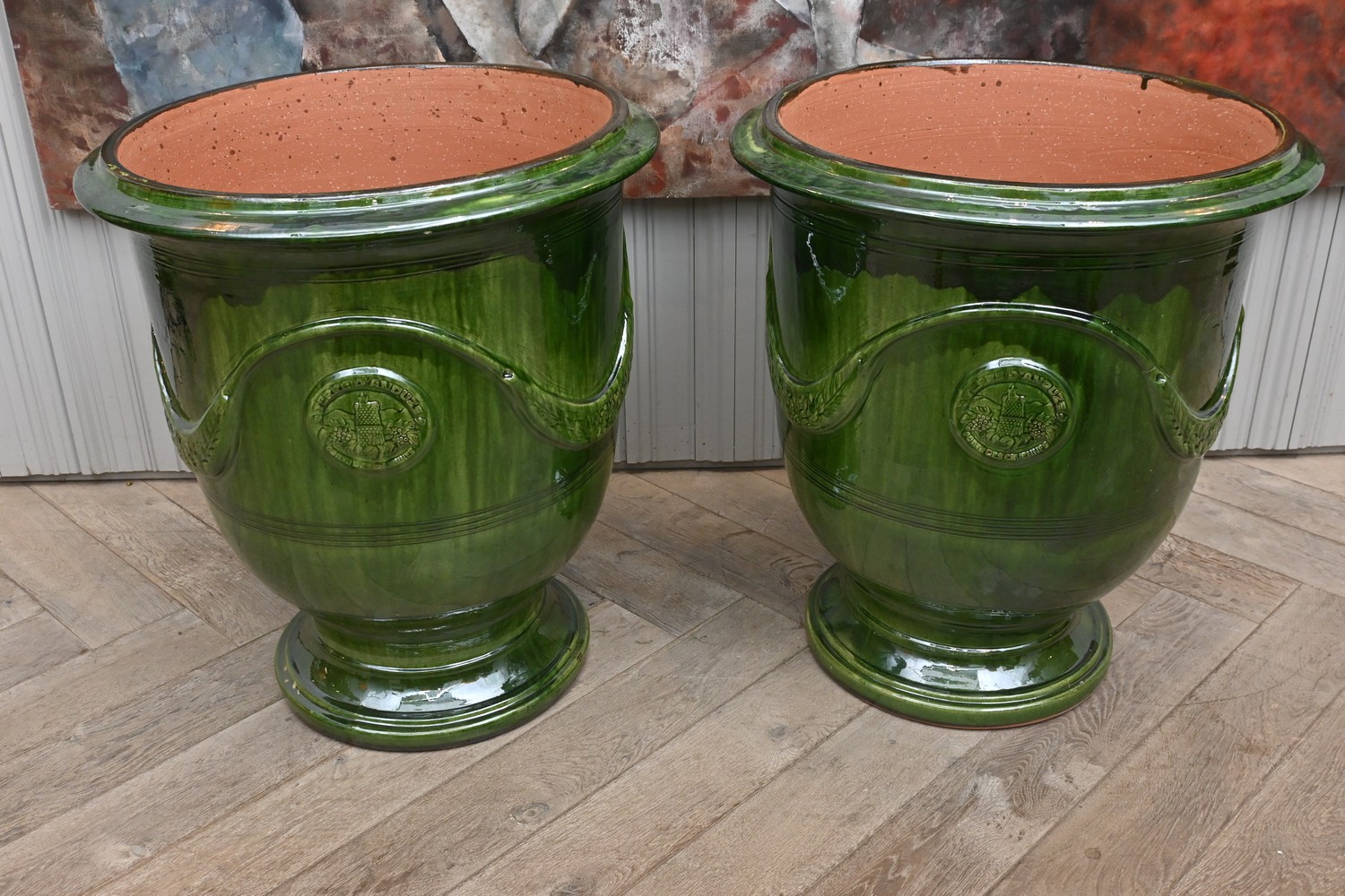 A PAIR OF FRENCH ANDUZE URNS (80H X 72D CM) (PLEASE NOTE THIS HEAVY ITEM MUST BE REMOVED BY CARRIERS AT THE CUSTOMER'S EXPENSE. LEONARD JOEL STAFF CANNOT ASSIST CARRYING THIS ITEM) (X-LARGE ITEM)