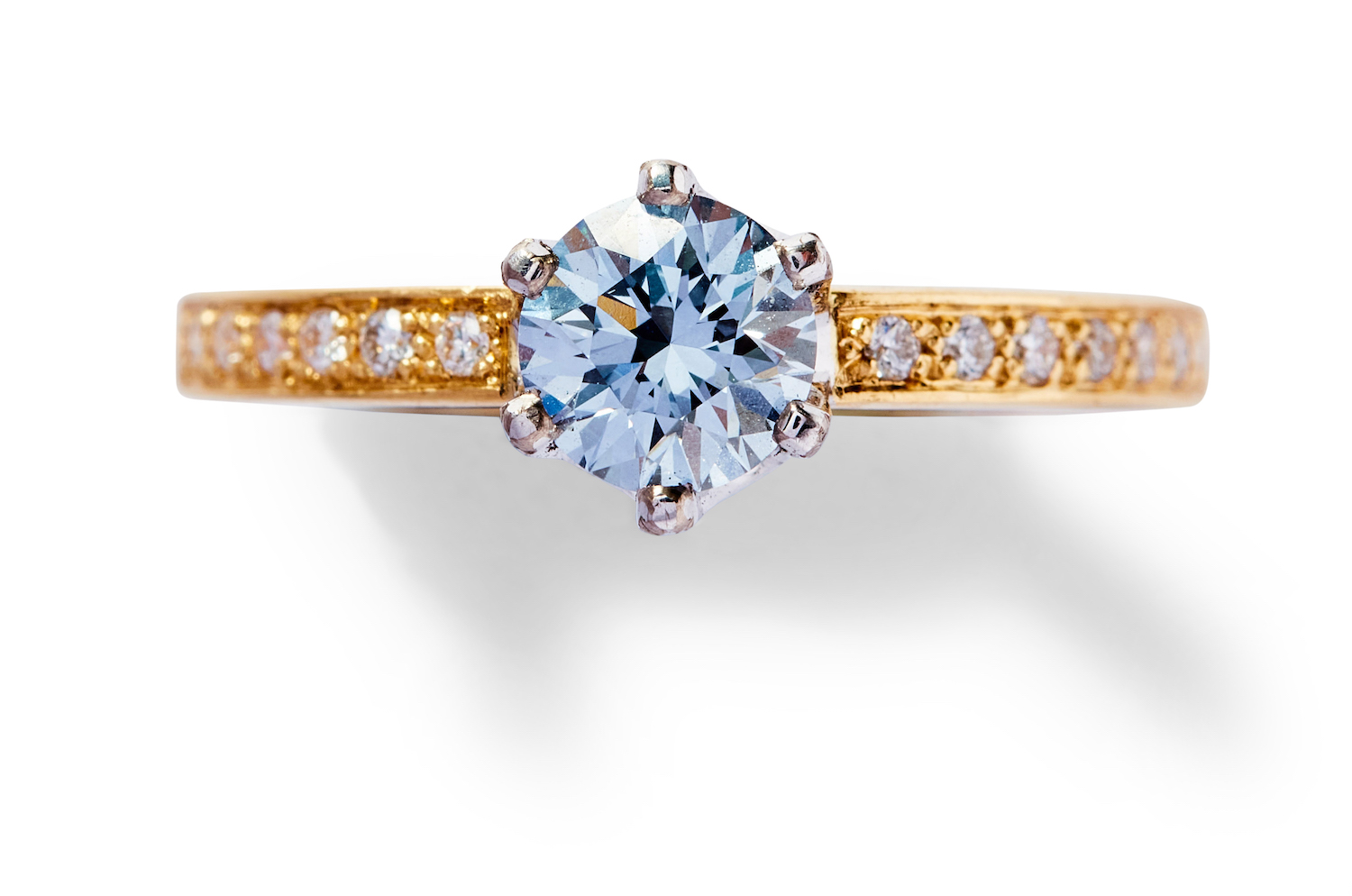 The natural fancy blue brilliant-cut diamond weighing 0.74 carats, is claw-set between shoulders pavé-set with brilliant-cut diamonds, mounted in 18ct gold, size O.