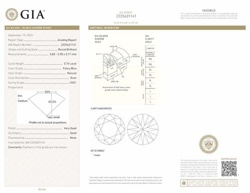 Accompanied by a GIA report numbered 2225631141, dated 19 September 2022, stating that the 0.74 carat diamond is natural, fancy blue colour, VVS1 clarity, laser inscribed.