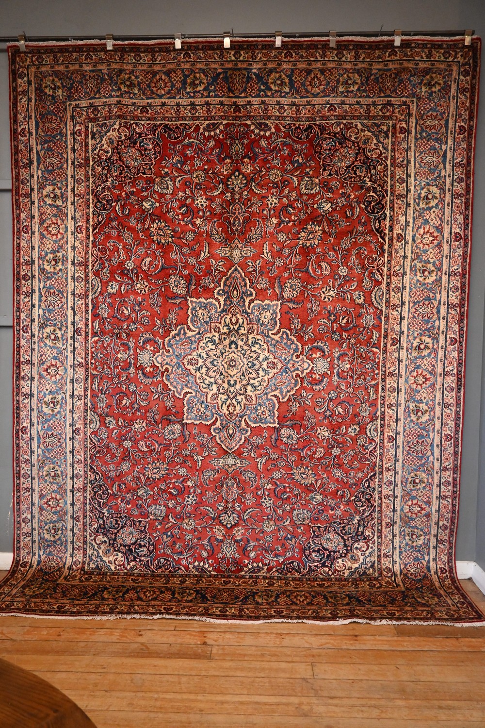 A WONDERFUL PERSIAN SHAHRBAFT RUG FROM THE HAMADAN REGION. 100% FINELY WOVEN WOOL SOLID & DENSE PLUSH PILE. FLORAL CENTRAL MEDALLION IN FRENCH BLUE AND IVORY ON A RED FIELD CONTAINING ALL OVER PALMETTES, FLORAL AND LEAF MOTIFS ON A RED FIELD. UNIQUE CORNER SCROLL MEDALLIONS OF ROYAL BLUE AND IVORY WITH FLORAL MOTIFS, BORDER OF PALMETTES AND FLOWER SPRAYS. IN PRISTINE CONDITION. SIZE: 365 X 275 CM- RRP $6,800 ORIGIN: PERSIA DOCUMENTATION OF AUTHENTICITY INCLUDED.