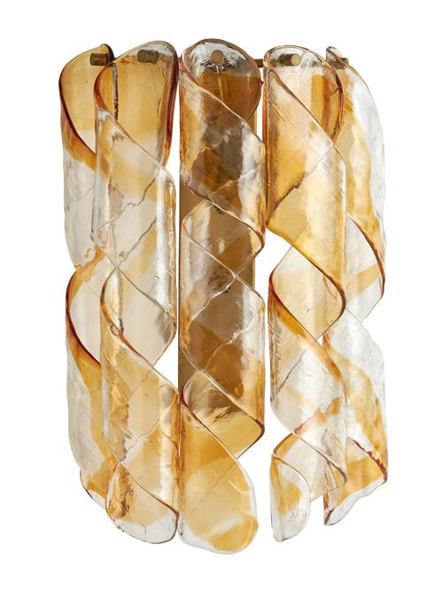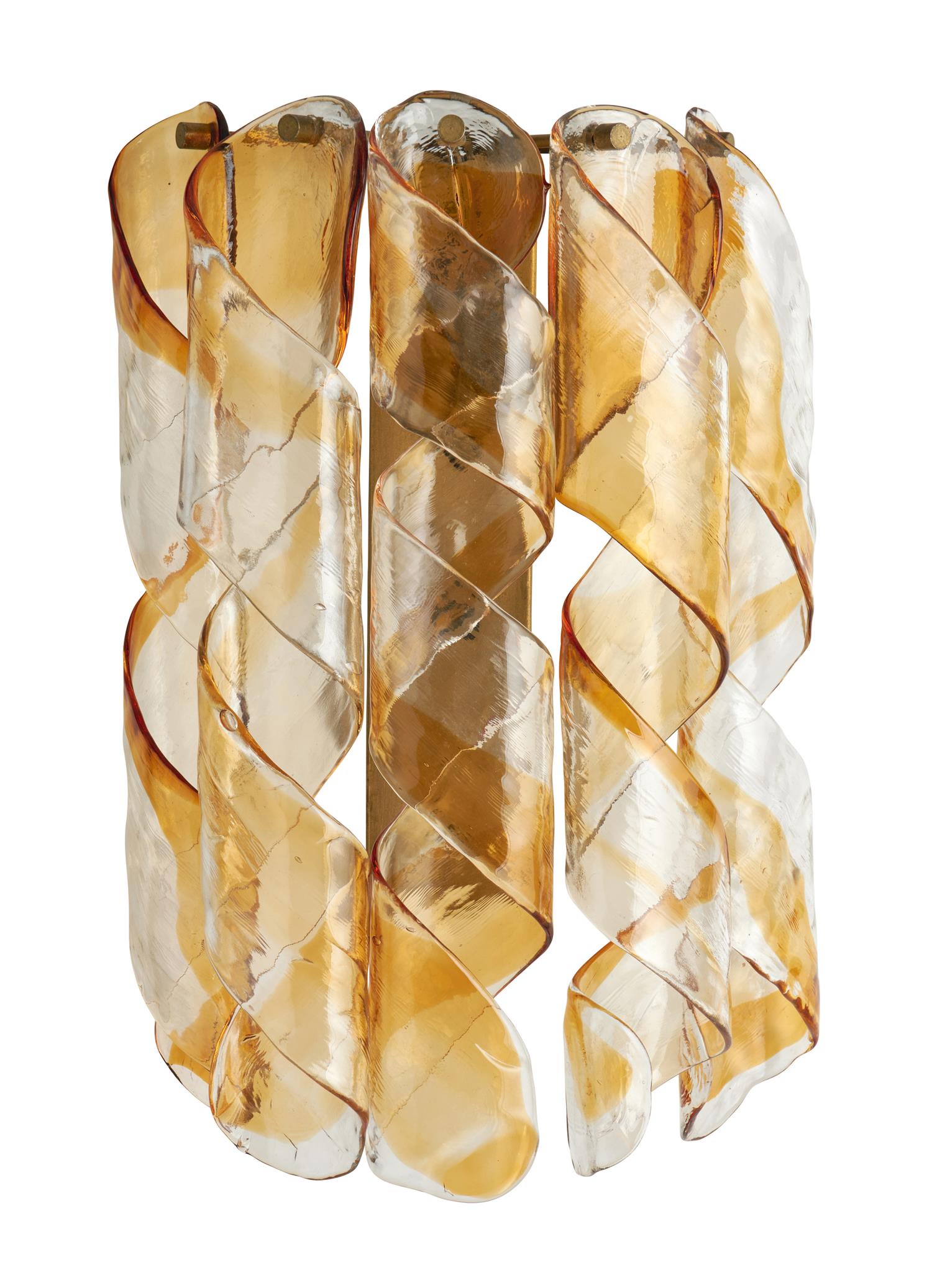 Glass elements in good condition overall, with minor surface marks, scratches and natural blown glass irregularities. One glass element has a repaired break to top. Includes one spare glass element. Some tarnish to metal wall fittings. Not currently wired.