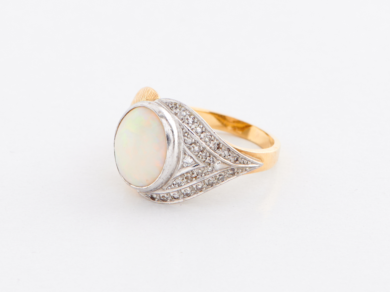 AN OPAL AND DIAMOND SET DRESS RING IN 18CT TWO TONE GOLD, THE OVAL CABOCHON CUT SOLID LIGHT OPAL WEIGHING 3.23CTS, RING SIZE Q, WEIGHT 8.4GMS, WITH VALUATION