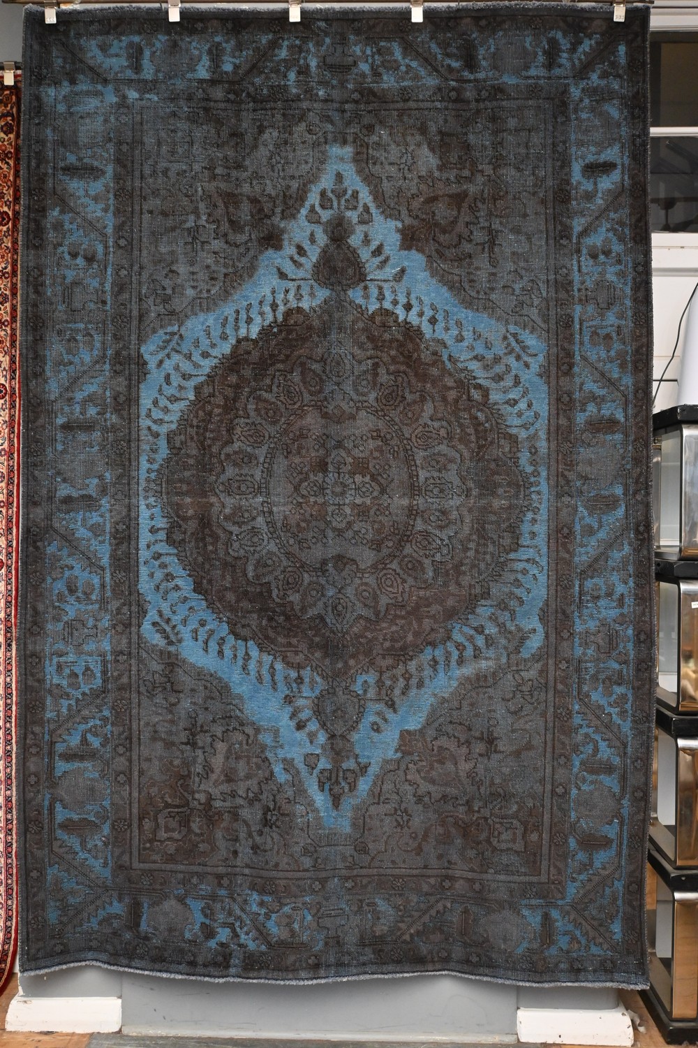 A CONTEMPORARY VINTAGE OVER-DYED PERSIAN TABRIZ CARPET. A UNIQUE MODERN CARPET CREATED FROM AN AUTHENTIC TABRIZ CARPET WITH A DISTINCTIVE MEDALLION. THE PILE LIGHTLY SHORN AND OVER-DYED IN A BEAUTIFUL CHARCOAL & BLUE TONES. ORIGIN: IRAN - RRP: $3,900- SIZE: 290 X 190 CM DOCUMENTATION OF AUTHENTICITY INCLUDED.