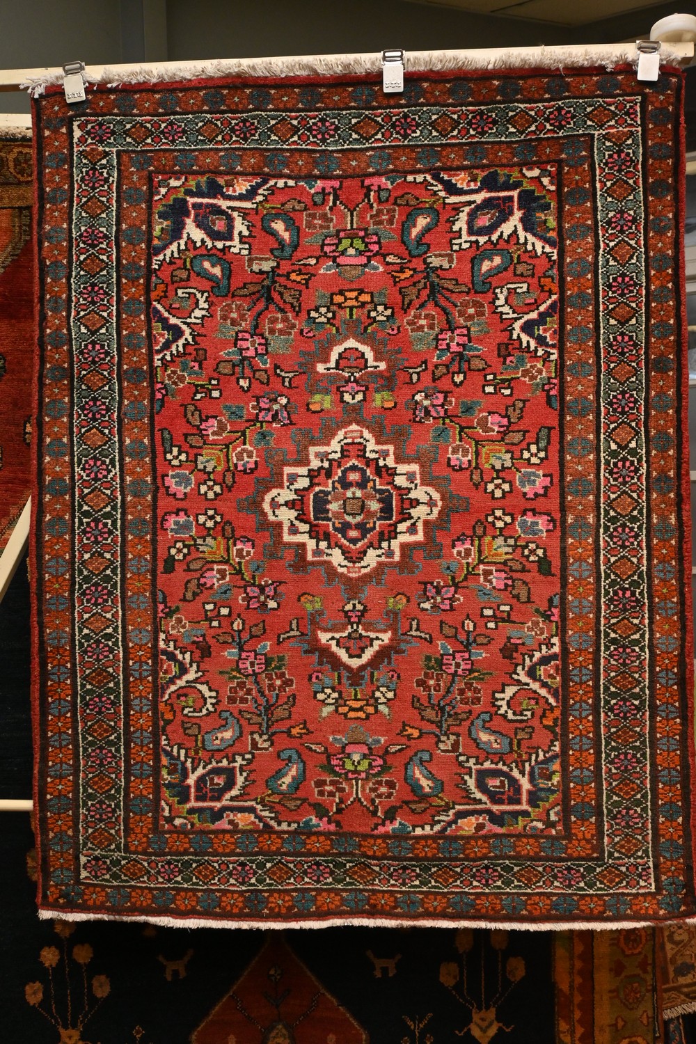 A PERSIAN MEHRABAN RUG, 100% WOOL. HAND-KNOTTED CITY WEAVE WITH TRADITIONAL DESIGN OF CENTRAL BOLD FLORAL MEDALLION, PAISLEY MOTIFS & FLORAL SPRAYS IN A RED BACKGROUND. BORDER OF FLORAL MOTIFS. SIZE: 138 X 110 CM ORIGIN: PERSIA - RRP: $1,200 DOCUMENTATION OF AUTHENTICITY INCLUDED.