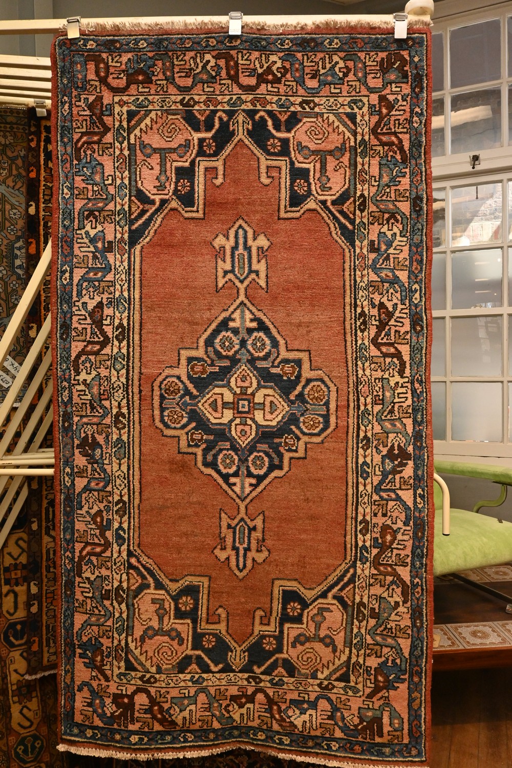 A PERSIAN EKBATANA RUG. 100% WOOL, VINTAGE PILE, NATURAL DYES. HAND-KNOTTED TRIBAL WEAVE WITH AND DESIGN OF A BOLD STYLIZED MEDALLION AND CORNER MEDALLIONS ON A SOFT RED FIELD. BORDER OF TRIBAL MOTIFS IN MELLOW TONES. SIZE: 201 X 105 CM ORIGIN: PERSIA - RRP: $1,900 DOCUMENTATION OF AUTHENTICITY INCLUDED.
