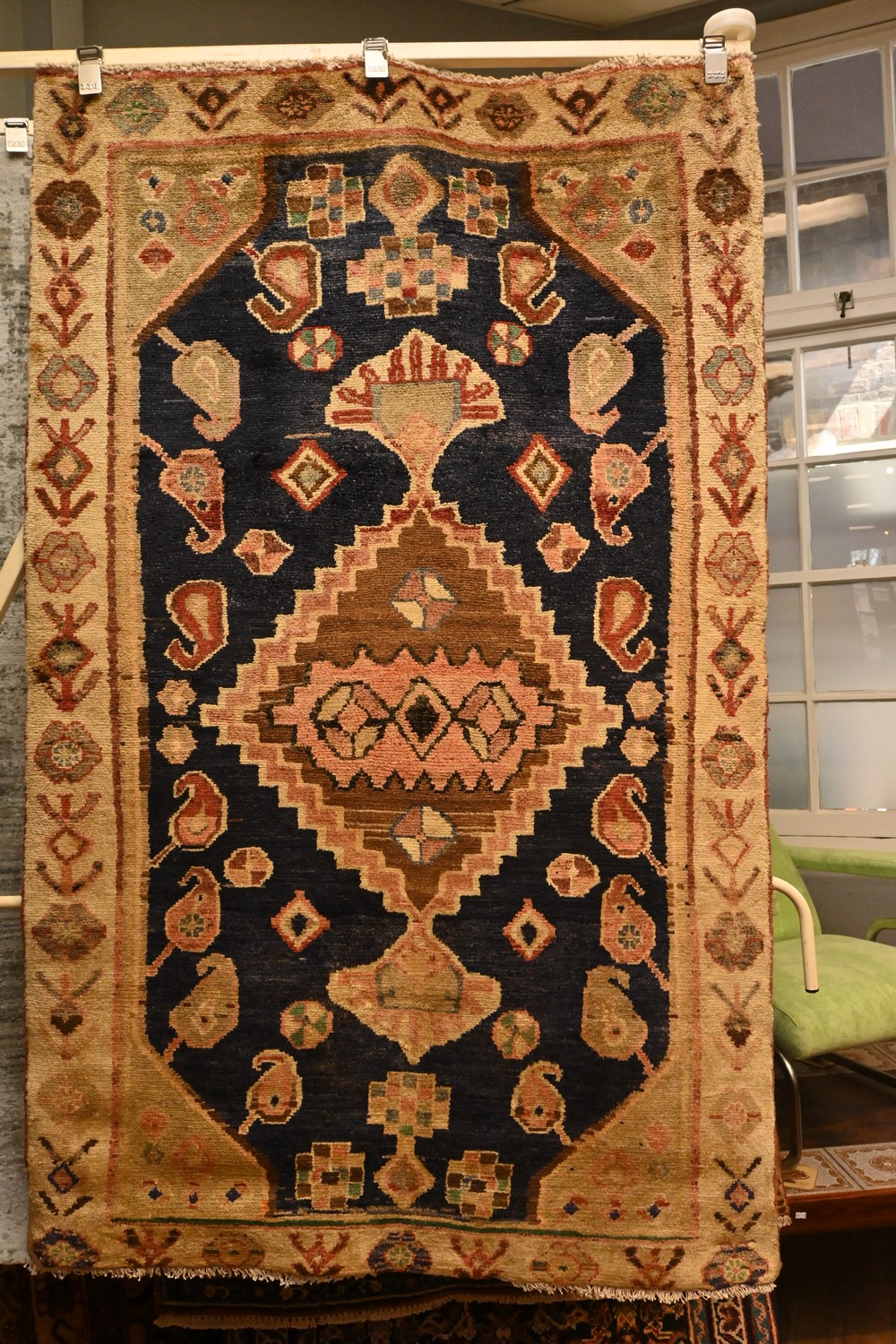 A TRIBAL PERSIAN ABHAR RUG. 100% WOOL. NATURAL DYES. HAND-KNOTTED VILLAGE WEAVE. TRIBAL DESIGN OF DIAMOND MEDALLION CONTAINING AN AMULET ON A NAVY BLUE FIELD WITH ALL OVER TRIBAL ROSETTES AND PAISLEY MOTIFS. TRIBAL FLORAL PATTERN BORDER. SIZE: 178 X 110 CM ORIGIN: PERSIA - RRP: $1,700 DOCUMENTATION OF AUTHENTICITY INCLUDED.